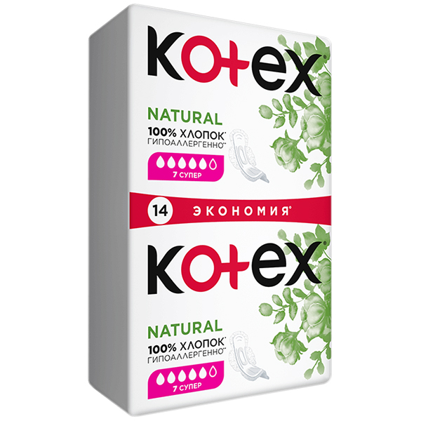 Защита от протеканий при обильных месячных обеспечена. Тонкие женские гигиенические прокладки Kotex Natural Super имеют удлинённый задний край, что гарантирует длительную и надёжную защиту белья.